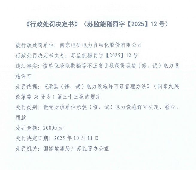 内容显示,南京电研电力自动化股份有限公司的违法事实是:该单位采取欺骗等不正当手段获得承装(修、试)电力设施许可。江苏能源监管办依据《承装(修、试)电力设施许可证管理办法》(国家发展改革委36号令)第三十三条的规定,对该公司罚款人民币20000元。