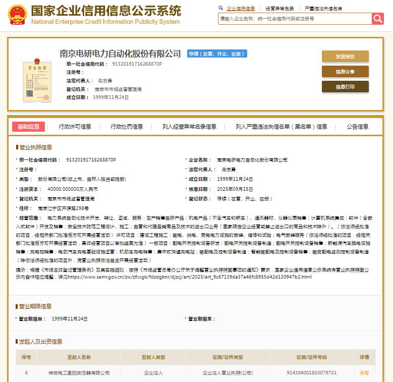 国家企业信用信息公示系统显示,南京电研电力自动化股份有限公司成立于1999年,注册资本40000万元人民币,法定代表人为朱志勇。